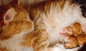So what happens exactly as your cat becomes pregnant? As a female feline is about to deliver her litter, she begins lactation. A cat has eight teats that can produce milk. A spayed cat can also produce milk – this occasion is known as pseudopregnancy.